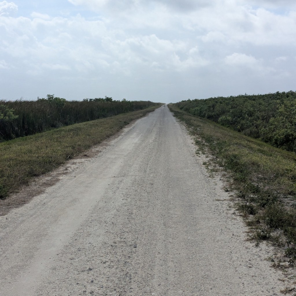 I stopped in Belle Glade to get supplies for the long day as once you leave Belle Glade, there is nothing – literally nothing – until Ft Lauderdale. Belle Glade is basically a farm town as there is tons of local agriculture in the rich dark soil, but it looks a bit downtrodden even though there was lots of morning activity. I got a Subway sandwich for later as well as a gallon of water and two bottles of Gatorade. I was loaded, but I ended up using it all! The first 25 miles were on a paved road with lots of dump trucks, but other than that not much traffic and they gave me a wide berth. As anticipated, there was a strong headwind so every truck pass gave me a few seconds rest in the draft. My route had me crossing over a canal and onto the gravel, but I ended up staying an extra 10 miles on the pavement after scouting it on Google Maps. I was worried that I’d get to the end of the pavement and not be able to cross the canal as that is where all the dump trucks were headed for some canal work. Fortunately I was easily able to cross over despite so many no trespassing signs. I think these are really meant to keep knuckleheads in 2/4 wheel motor vehicles out.
