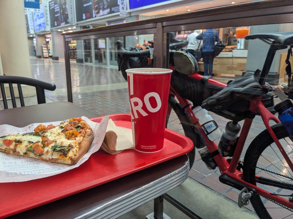 I purchased a regular coach fare for $80 plus $20 for the bike. The published transit time was about 16 hours (1:43p – 6:25a), a bit longer than driving, but… I thought about taking the commuter bus from Annapolis to Union Station in as I like the idea of being “self sufficient” on this kind of trip, but given the weather and the departure time in the afternoon, it was just easier for Lisa to drive me to Union Station. She brought me in about noon to fit her schedule and of course the train was late and didn’t leave until about 4:30p so I just hung around Union Station and amused myself. Once we were finally boarding, I was instructed to take my bike to the baggage car, different than I’ve done in the past where the bike is in the car in the janky racks. But despite not knowing what they do with it in the baggage car after handing it up to the staff guy, it worked out fine.