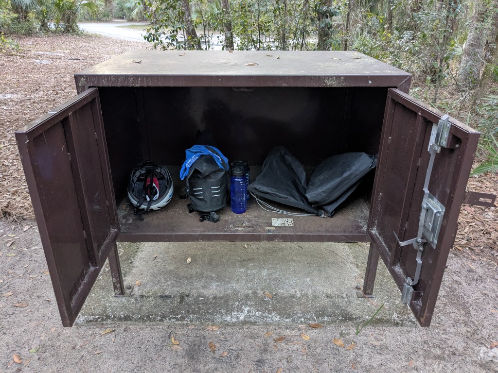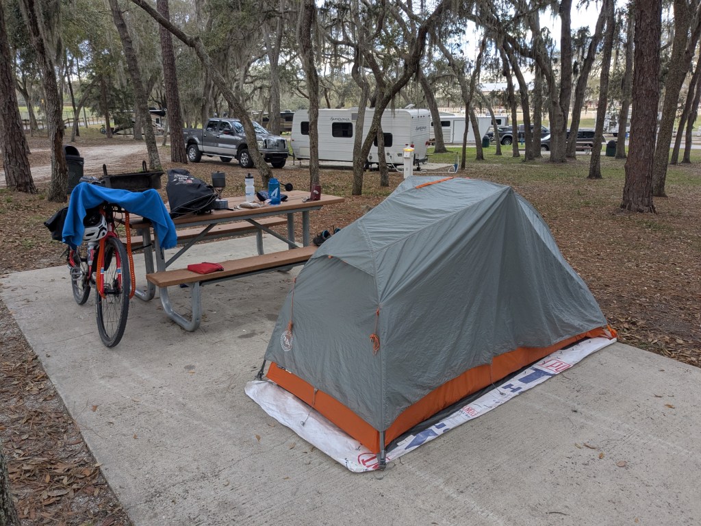 Even before those stars aligned, I have been scouting and planning this route for some time, really since I found the central part of the state so interesting on the Coast to Coast trip a few years ago. I nominally started with the path of the Florida Trail as well as some routes I purchased from the Single Track Samurai but those typically are only suitable for bikes with 2.5″ MTB tires mostly because of the sandy/soggy terrain. So I started altering the route to find more gravel friendly dirt. The tradeoff was a bit more road riding, but in the boonies of central Florida there’s really not any traffic to speak of. The route ended up being 435 miles with about 20% unpaved. I broke it up into the usual 60 +/- mile days, a comfortable distance with my fully loaded rig, realizing there would be some longer and some shorter days to make the available campsites work. Of course full service campsites are nice but I’m ok with “primitive” sites (meaning no water or electricity, but usually pit toilets); they just require a little more forethought so you have enough water and can find a close spot to purchase your “step 2” (the Camping With Steve reference I’ve made before). In the end it was seven riding days and six nights (two primitive and three full service campgrounds and one hotel room).