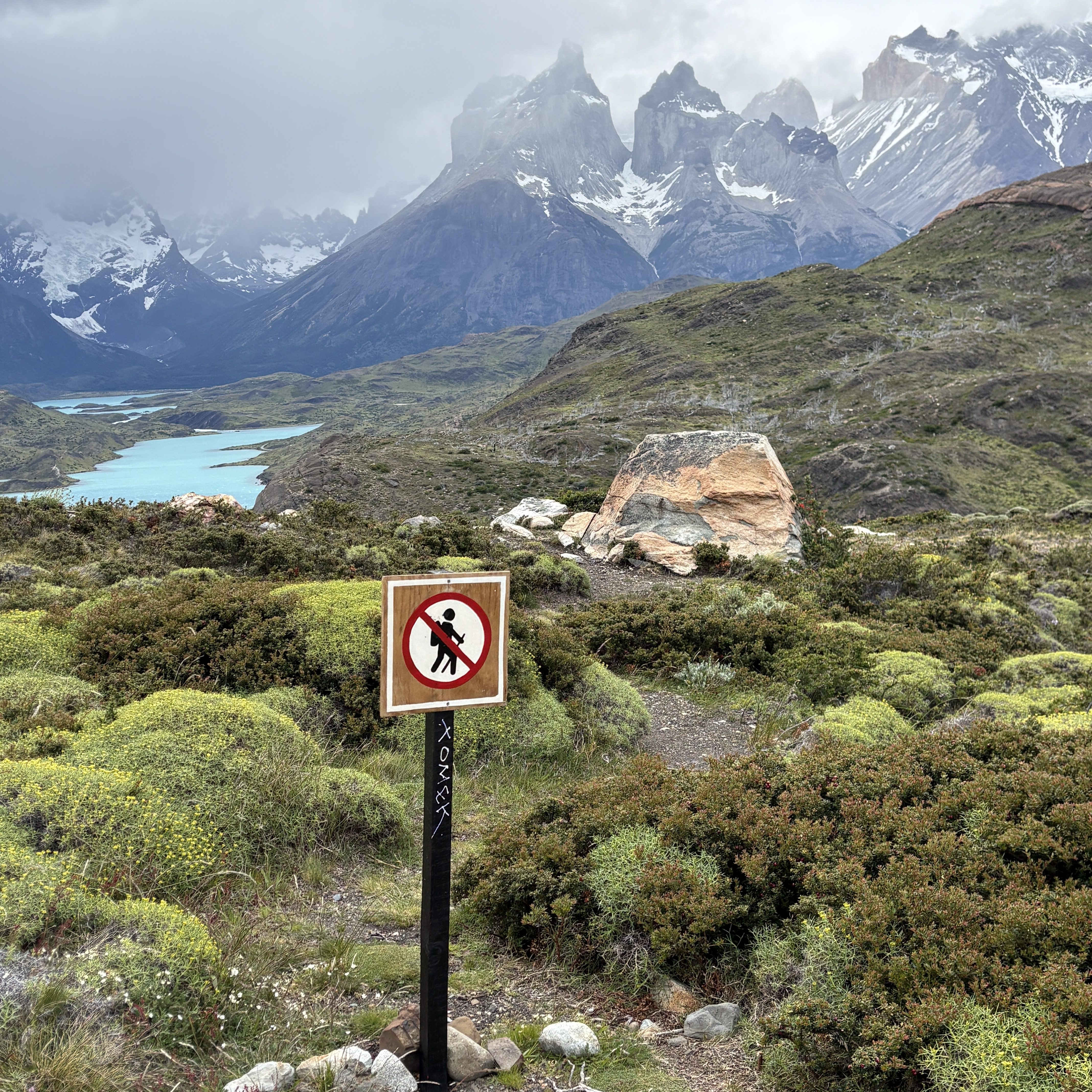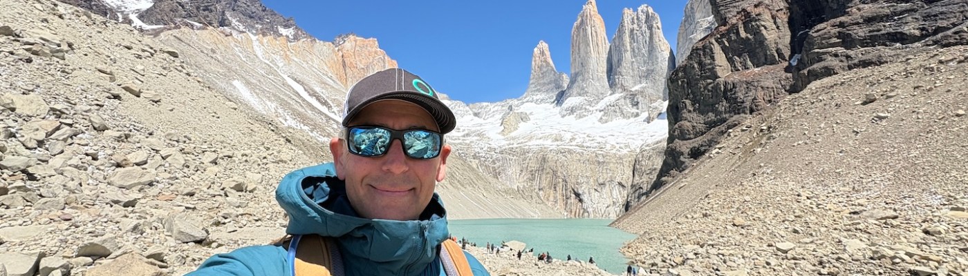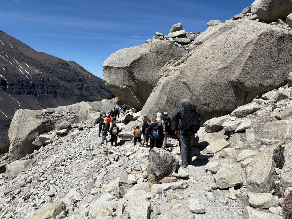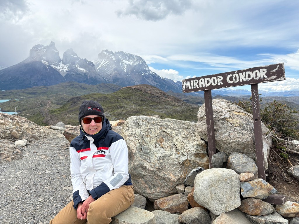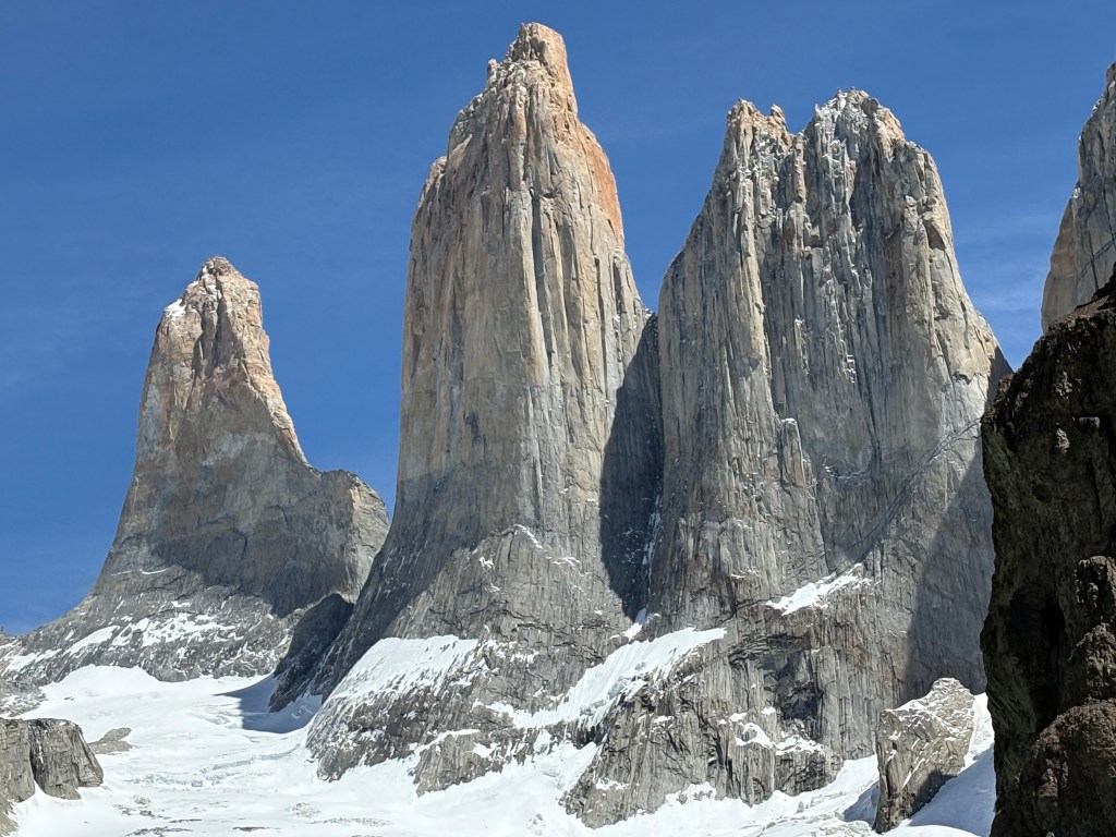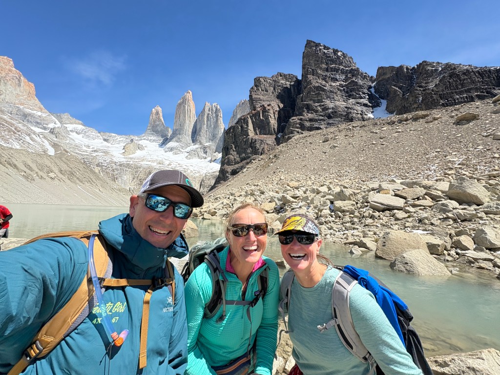 It was a very chilly morning but the cloud cover cleared by the hike start and the outer layer didn’t last long. We started a little on the late side at 9:15 (for the early shift anyway) and the reviews said it would be sort of a “conga line” affair which turned out to be pretty much true as this is the most popular hike in the park. It’s rated hard due to the length but is pretty accessible for a fit hiker, adding to the number of people that do it. That said, I was a bit surprised to see some really young kids and some adults that looked pretty out of shape. I’m a reasonably fit guy and it was hard for me. But then again, I do have to enroll in Medicare this year… It’s mostly just walking up with a number of steep spots, switchbacks, and rutted paths though wooded areas and much of the surface was loose granite rocks. Trekking poles really helped. The last 1.5k gets much steeper, just shy of “scrambling” but you had to pick your way through the boulders and seemed like it went on forever. Just when you think it was right around the corner there was another pitch. But eventually you could see Las Torres peak (pun intended) over the rock and the next turn was the “Ta Da” view.