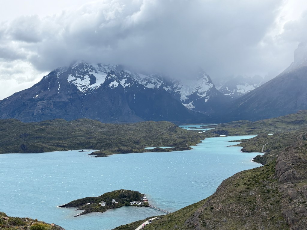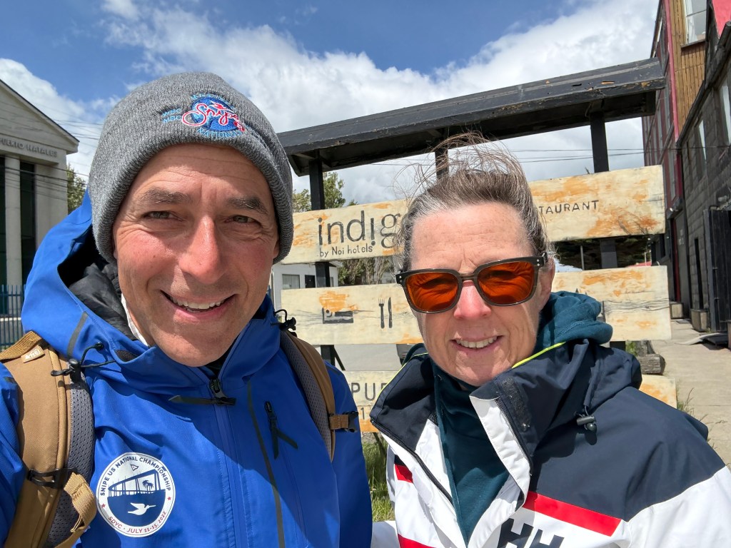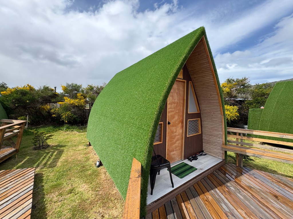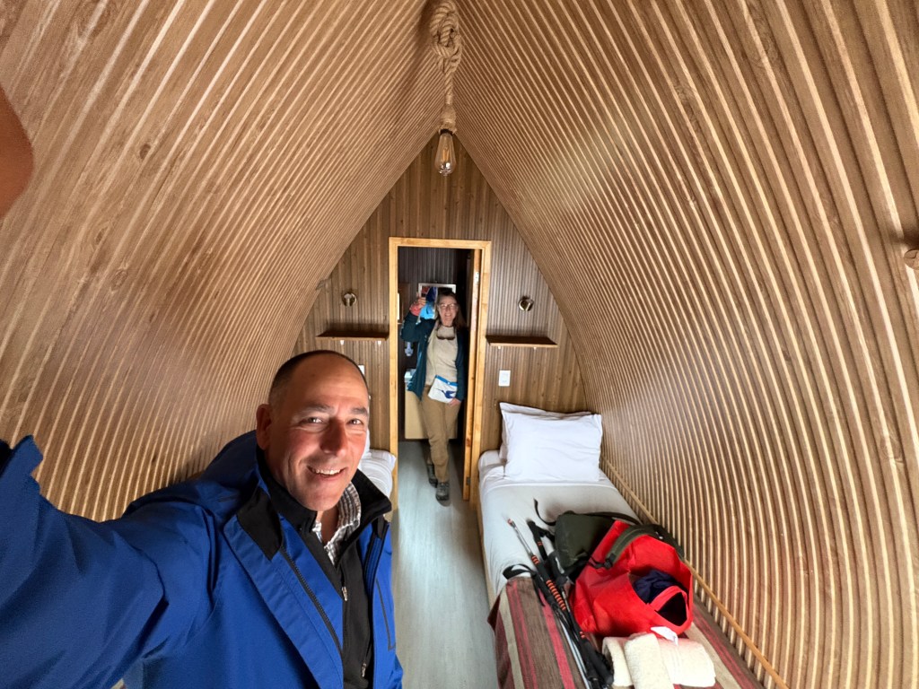 The next day we drove to the Morrena Lodge just south of Torres del Paine, a 90 km drive north. But it took more than three hours as it was all gravel and in terrible shape. The lodge is located in what I would call an “outpost” called Rio Serrano – can’t really call it a city or town – of several hotels (one a really bougie place that we went to for drinks) and some government buildings. Once we got checked in we hiked around the Serrano River for a bit to stretch our legs. The Morrena Lodge is a really nice place with a very comfortable “campy” feel, a nice restaurant and a third space with great (Starlink-based) wifi. The booking we had was for one of their “tiny houses” out back which was really cool. Kind of reminded us of a cross between the van or cruising boat and a Hobbit house. It had two small twin beds and a small head/shower. While it was pretty cold at night, not quite down to freezing but close, there was decent heat and it was a very cool Alex and Lisa kind of experience.