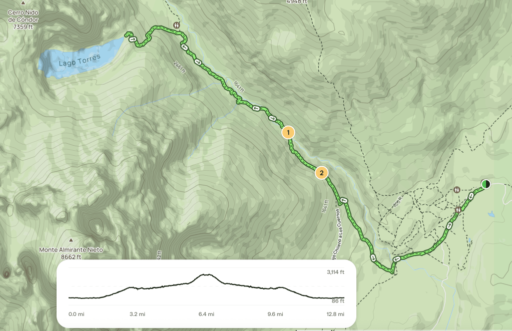 The route is essentially up the valley made by the river that the lake at the top drains into, although it doesn’t really follow the grade of the river. It occasionally goes way up above the valley in places, then down across various foot bridges. This is the route: Torres del Paine viewpoint via Las Torres – El Chileno Trail on All Trails: https://www.alltrails.com/trail/chile/magallanes/mirador-torres-del-paine-via-sendero-las-torres-a-chileno