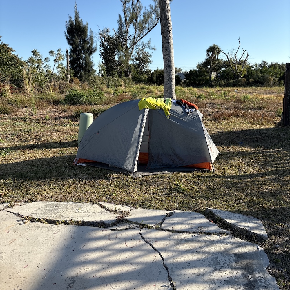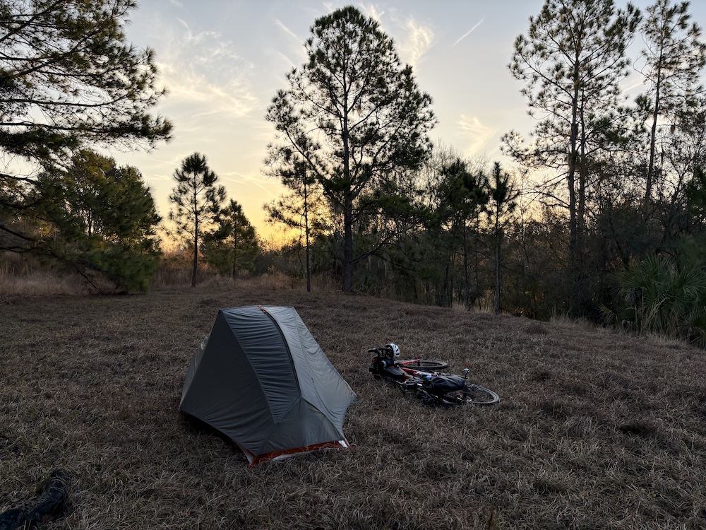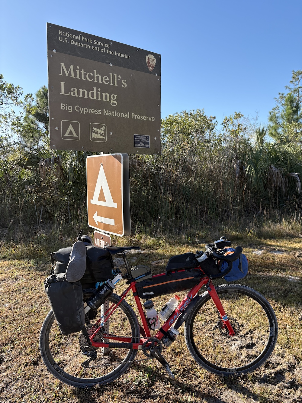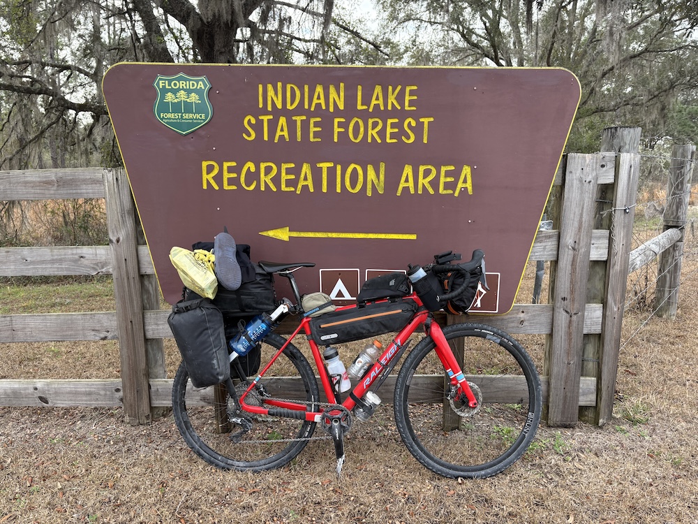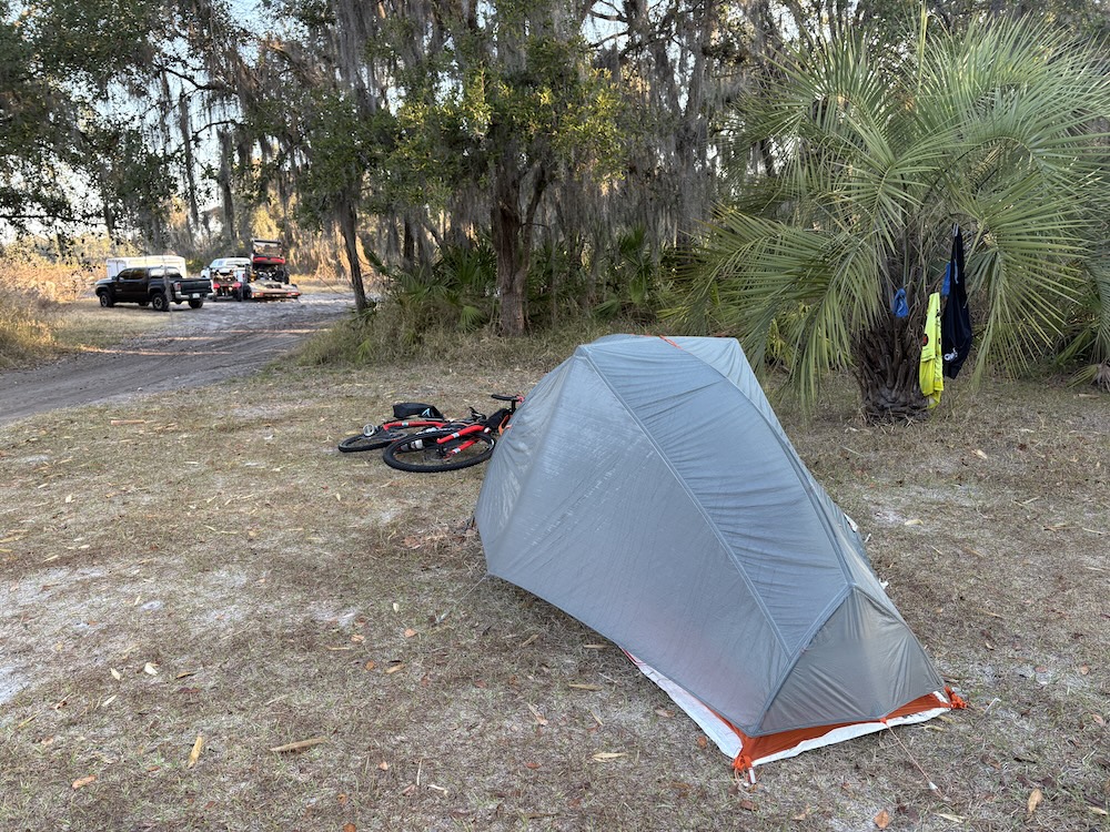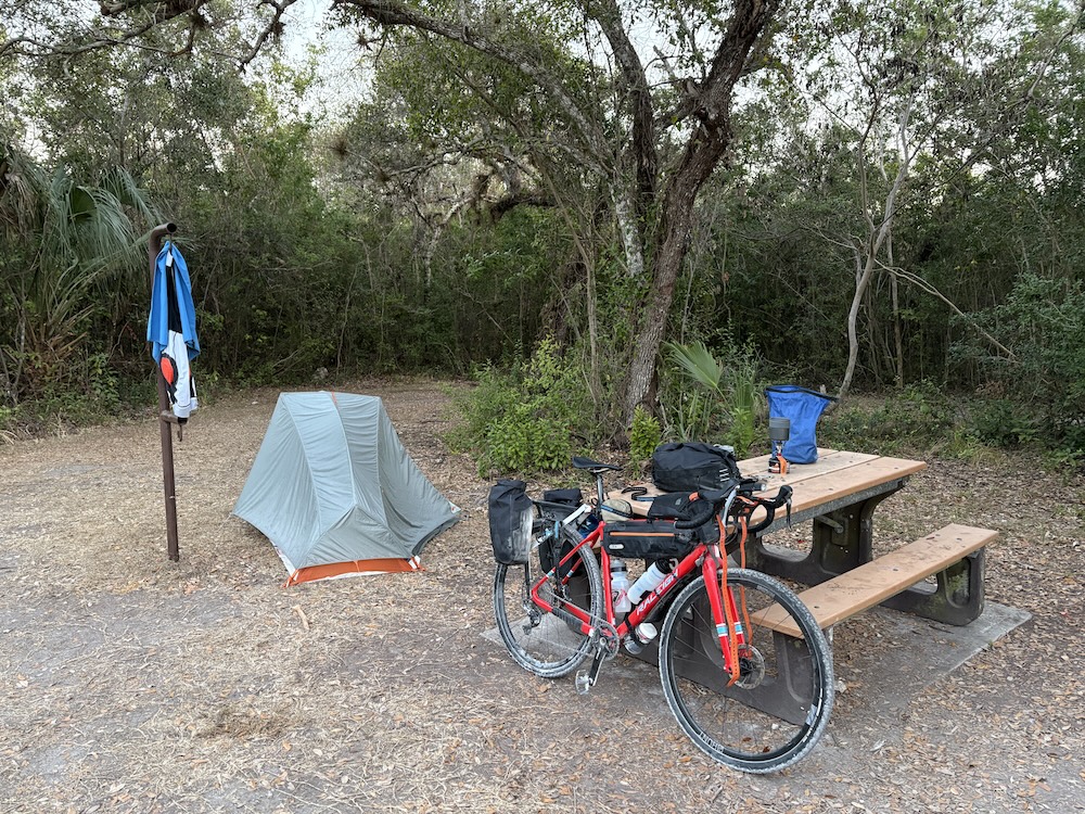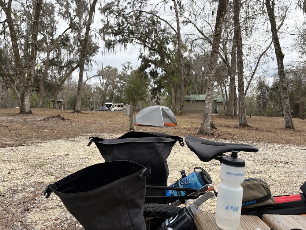 There were several new things in my bikepacking setup. I upgraded my sleeping bag from a down “quilt” that was really cold below 50 F to a down bag rated for comfort at 40 F. History showed that was necessary and boy was I glad I did. Because it is slightly more bulky, I swapped one of the Tailfin 10L mini panniers for a 16L Tailfin pannier. That worked well and at the risk of scope creep, I may also get another for the other side just to have a little space headroom. I also swapped out the top tube bag from the Apidura I’ve had for a long time for a Tailfin 1.1L Flip bag because the zipper (and my subsequent repair) broke. I really like this bag as it is very easy to open while riding so I can grab my phone quickly and there is enough room for my Dynaplugger, a small tube of sunscreen, some cash and a Cliff bar. Other than that, everything was exactly the same as I described in 2024. I did have to stop at Dicks Sporting Goods in Ocala to get some more dehydrated backpacker meals and to replace the drybag that raccoons tore apart at Cypress Glen (remember to ALWAYS hang your food bag!).