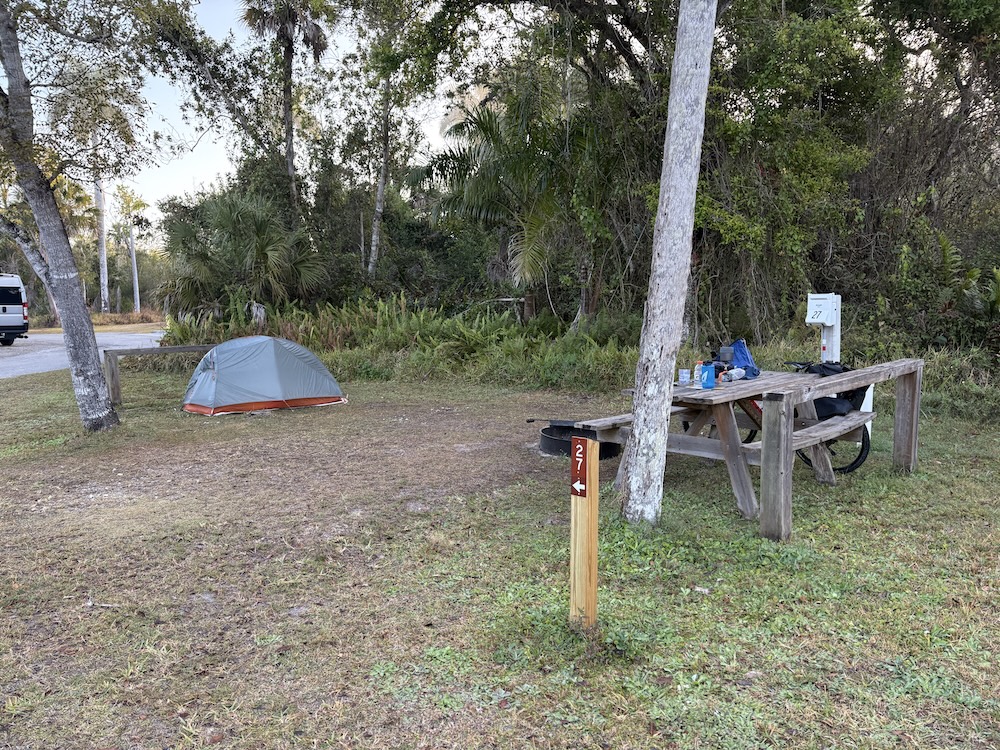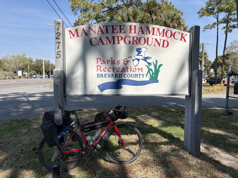 | 13 | Manatee Hammock Campground (Brevard Co Park) | 61.7 | 4:21 | A nice ride down to the Titusville area to the Manatee Hammock Campground. The first half was through residential neighborhoods south of Daytona, then some semi-rural roads and the second half was on the E Central Regional Rail Trail that connects into the Florida Coast to Coast Trail into Titusville that I did the other direction on the C2C route. Had dinner at a brew pub a few miles from the campground and made it just in time to see a SpaceX launch! It was the last really cold night and fortunately a guy I met gave me an old army blanket I put over my sleeping bag that really helped. Another backpacking meal night. |