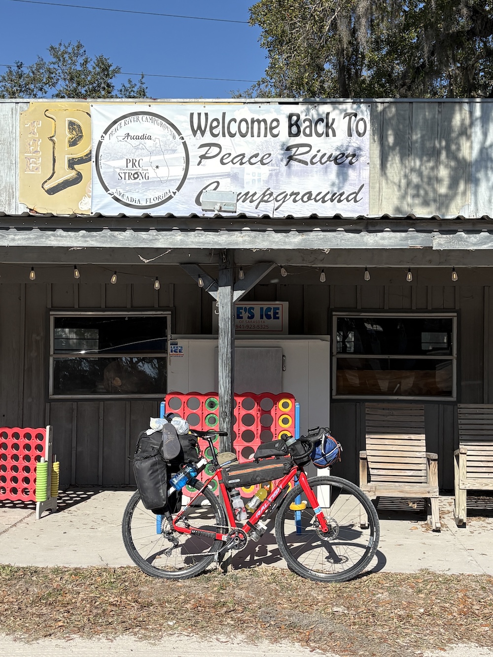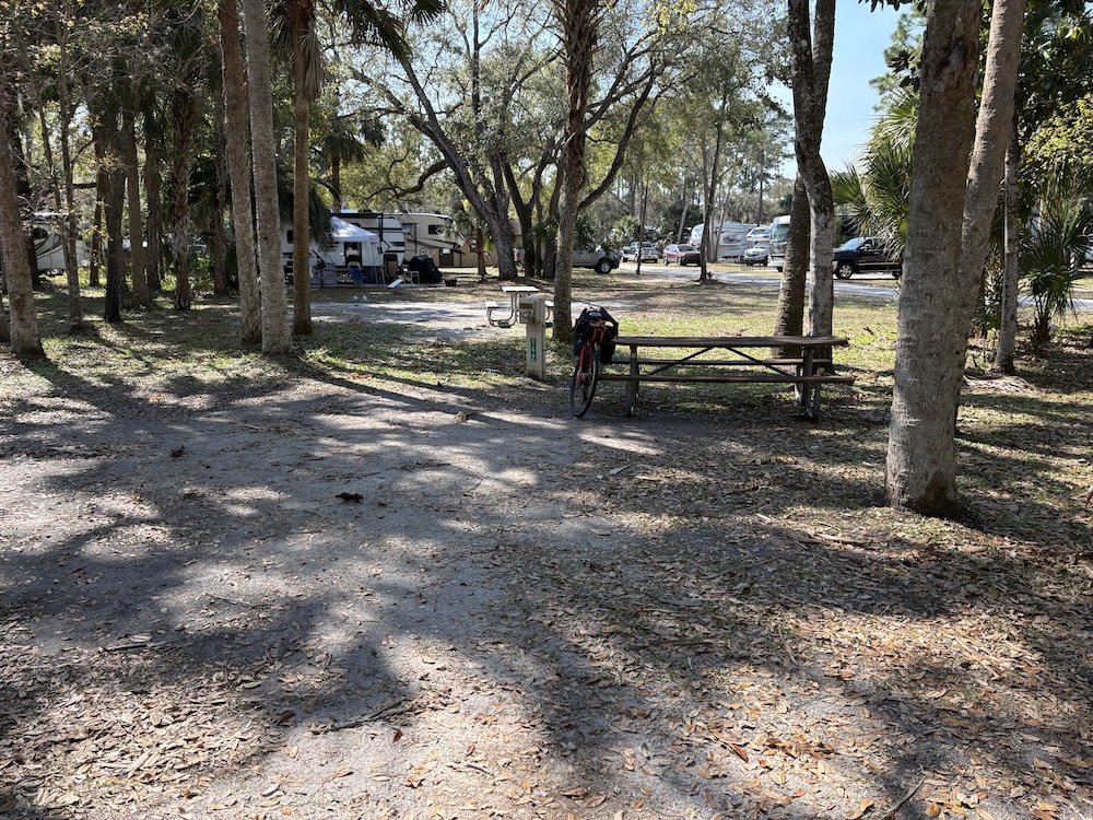| 4 | Arcadia Peace River Campground | 63.2 | 5:01 | The first half of the ride was lots of “concrete single track” (aka sidewalks/shared use paths) through the outer Ft Myers area along some major arterials. The second half was a 35 mile slog up FL 31 with a bit of a headwind. The campground was a ORV place, something very different: one of these things is not like the other! I thought about going into historic Arcadia for dinner but ended up having another backpacker meal night. |