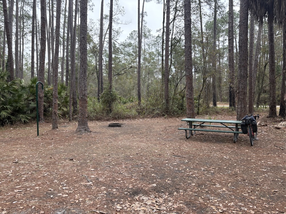 | 7 | Cypress Glen Campground Withlacoochee State Forest | 21.4 | 1:45 | A super short/recovery day up the beginning of the Withlacoochee State Trail to the Cypress Glen Campground. I got a puncture leaving Dade City that required a dynaplug. The Cypress Glen campground is near the Silver Lake campground I stayed at a few years ago, but quite a bit quieter as it’s further away from I-75. Didn’t hang my food bag and raccoons ripped apart my dry bag and food. Another backpacker meal night. |
