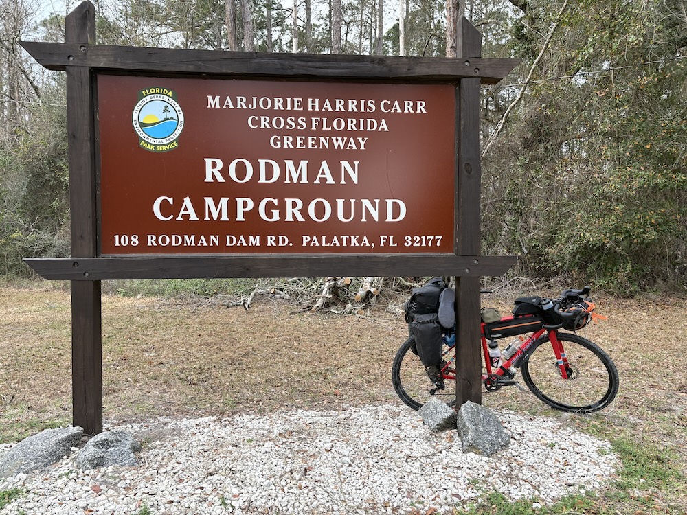 | 9 | Rodman Campground (State Park) | 47.1 | 3:09 | Pretty nice day with mostly a SE tailwind into Ocala National Forest. The initial route took me on some unpaved forest roads that were no bueno due to deep sand and had to go back out to the road. I took a route that I did last year on NFSR 11, which is the nicest surface in the forest. This took me right up to the Rodman campground. Another backpacker meal night. |