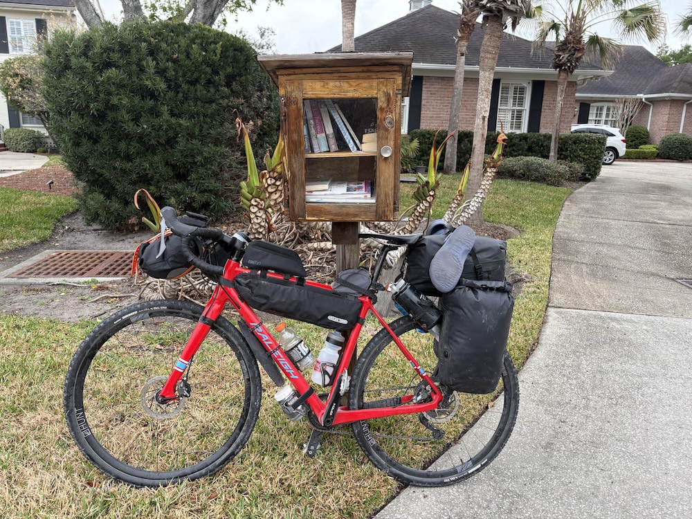 Jacksonville is a little over half way at 10 days and was time for several days rest. As I’ve commented before the first three to five days is always the hardest because everything hurts (this time it was my triceps) and a rest day is usually in order after a week. After that things settle in and stop hurting. On this trip it took a bit longer to get to that point because I had been off the bike for almost two months between the Chile trip and the cold weather in January that prevented any substantial riding. By the time I got to Jacksonville, despite my earlier short day, I was definitely tired and had some, uh “irritation” in the undercarriage that needed a few days with no pressure to resolve. It fortunately did fully heal up by the time I left after two days rest. On bikepacking trips about the only thing that can stop you dead in your tracks are saddle sores if they get really bad.