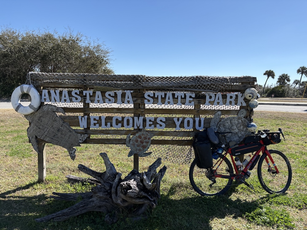 | 11 | Anastasia State Park | 65.5 | 4:40 | A nice run down to Saint Augustine and Anastasia State Park. The cold front went through in the morning and the breeze came up hard out of the northwest so I had a nice tail wind. Met up with another Duzer follower Brett Hack, who showed me the priority Gemini, which is definitely my next bikepacking bike. Nice to have someone to ride with for a few miles. I detoured off A1A to go through Guana NWR for a nice 15 miles of easy gravel. I stopped for a nice Asada Bowl just north of the State Park for dinner. Fun to be at Anastasia again as it reminds me of the week Lisa and I spent here during COVID in 2021. |