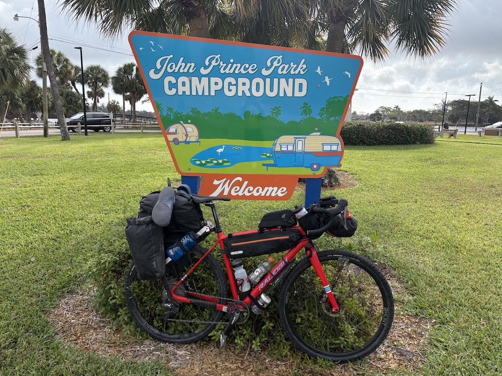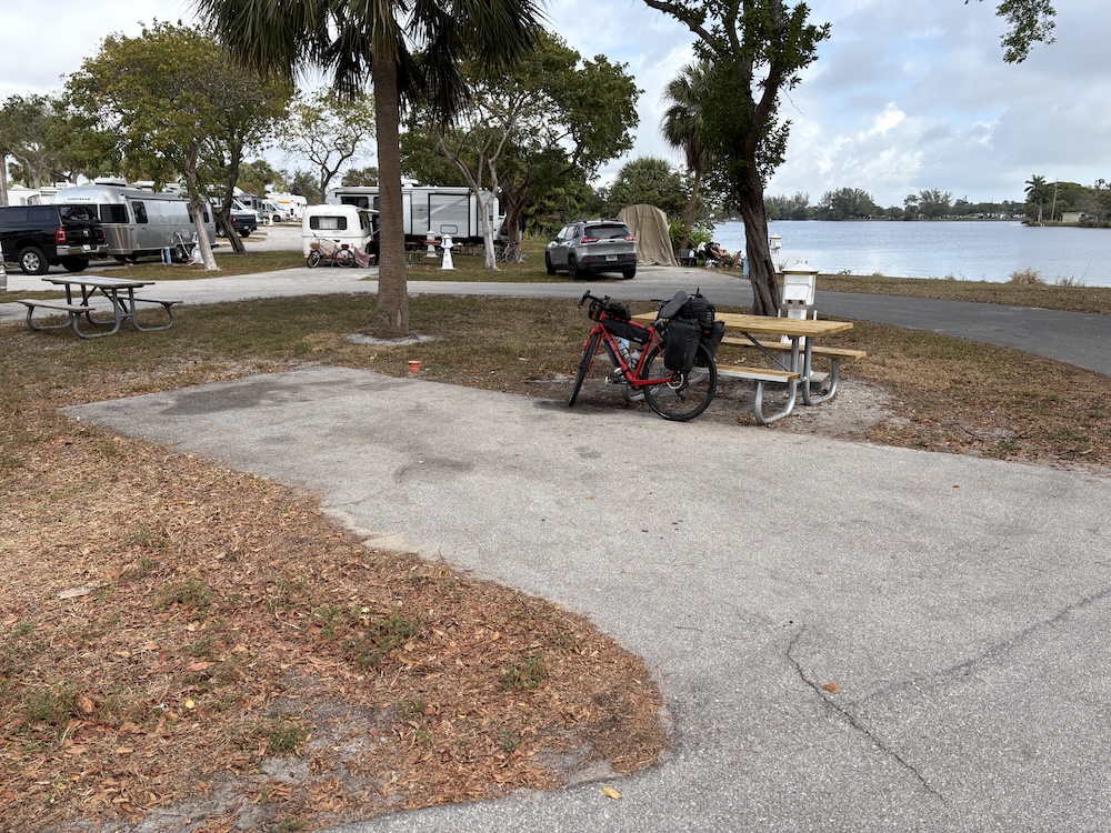 | 16 | John Prince Park (Palm Beach Co Park) | 64.9 | 5:27 | The penultimate day. I definitely paid for the no chain days with a 20 mph headwind all day. I should have realized where I was because I got turned back on Palm Beach by guys with ear buds and black SUVs. There is only 1 road south by Mar-a-Lago and it was closed. But a proper windy, hot south Florida day. John Prince Park is in Lake Worth east of I-95 and seemed a bit sketch getting there, but was a decent RV park with nice amenities. I thought about going to find a restaurant, but was too tired to ride anywere on the local STROADs so another backpacking meal night. |